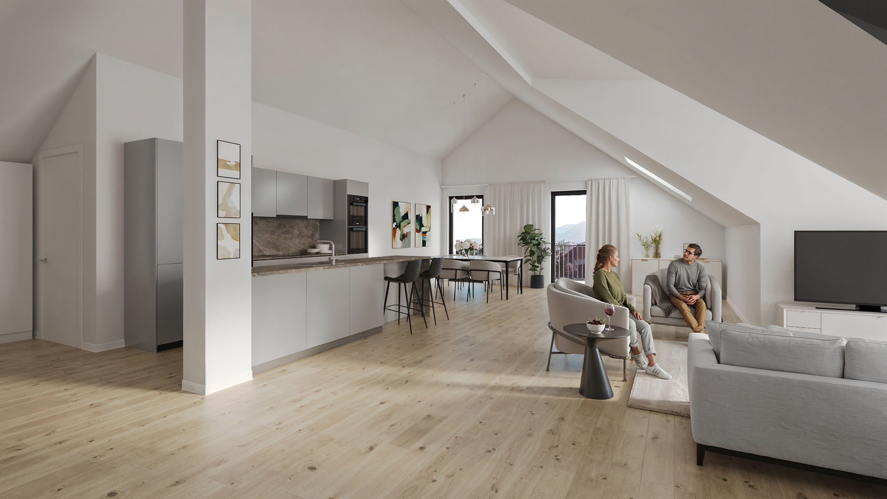Das Dach, die Gauben und die Höhe geben dem Wohnen Struktur und Atmosphäre. Die Wohnung wirkt offen, hell und gleichzeitig sehr privat. Dazu kommt der Blick ins Grüne, der dank der angrenzenden Freihaltezone auch langfristig erhalten bleibt.